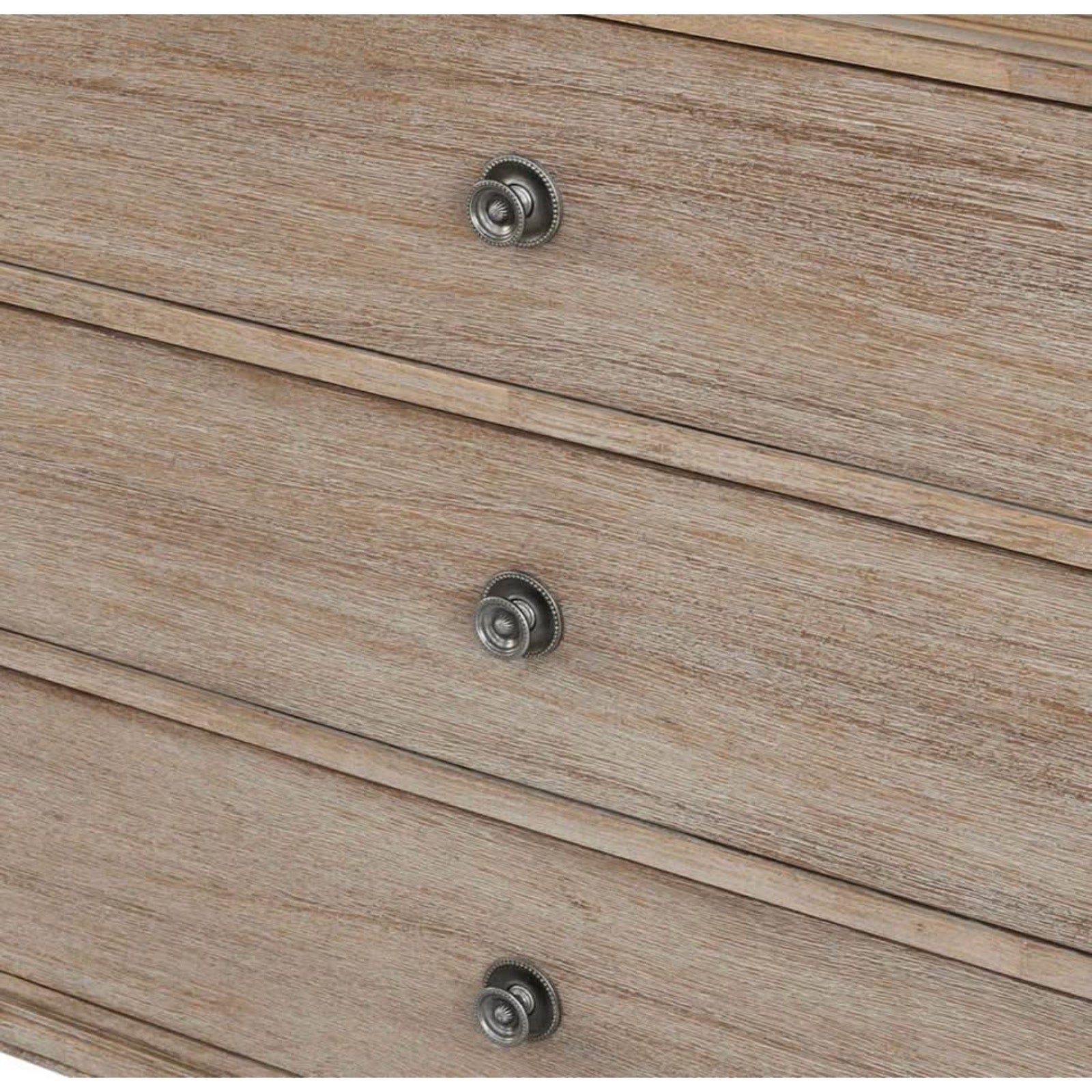 • Modern Classic style dresser cabinet features molding details, turned legs, antique finishing on wood and metal drawer knobs.