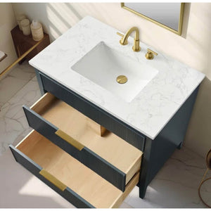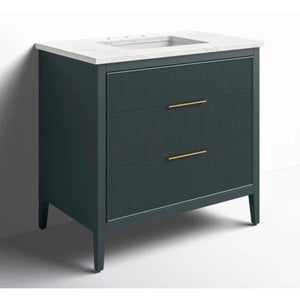 This single vanity set is your ticket to a stylish and organized bathroom upgrade, especially in smaller spaces. With its Arabescato engineered stone countertop and fluted design, it brings a trendy vibe to your space. The solid and engineered wood base is paired with brushed bronze hardware, adding a sleek contrast to the solid finish. Two soft-close drawers offer ample storage for all your essentials, while the undermount ceramic sink keeps things streamlined. The rectangular sink is centrally located, making it easy to wash up. Ready to make a statement? Pair it with an 8" widespread faucet to complete the look.