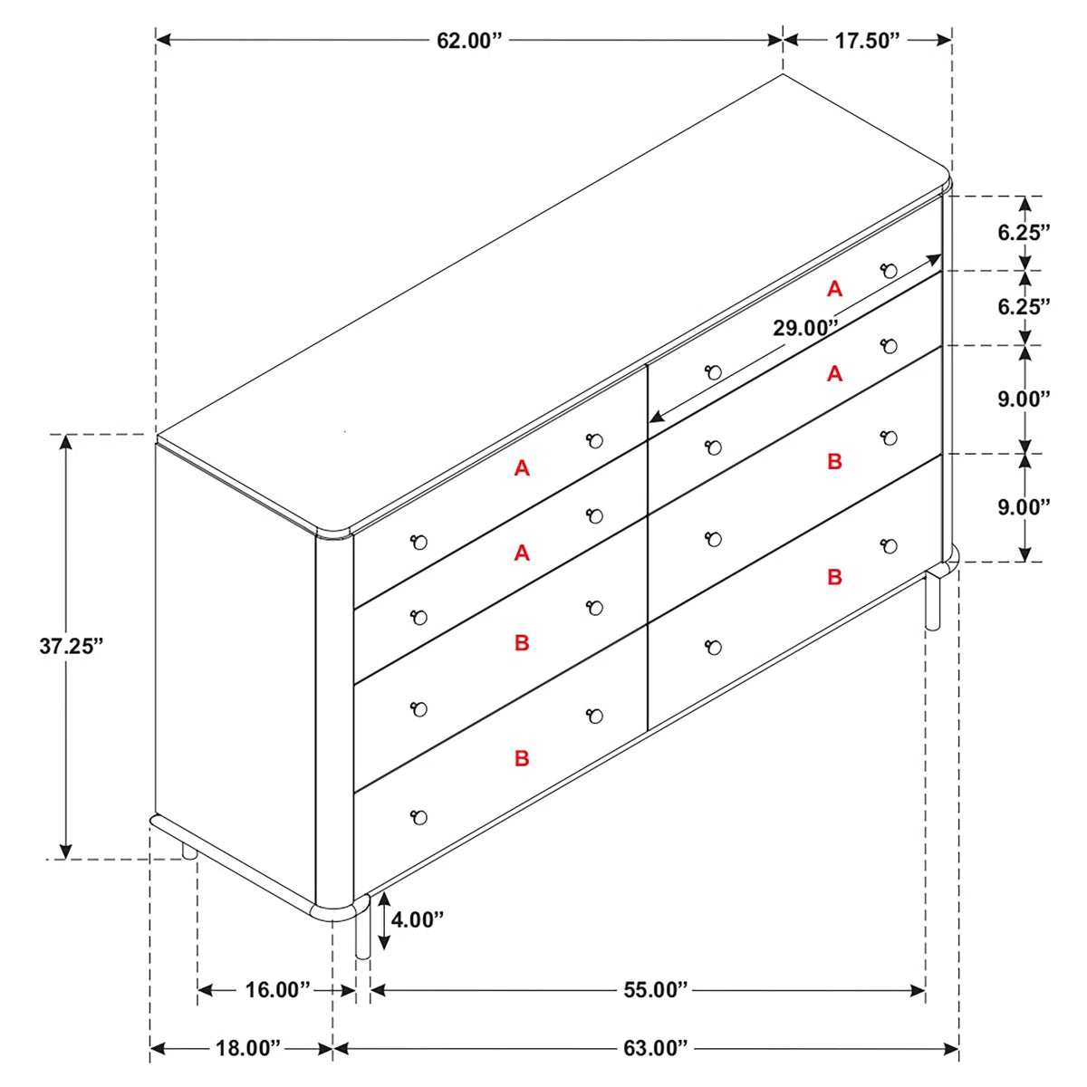 Graceful lines are enhanced with the wire brushed finish and wood grain details of a modern dresser. Eight drawers create ample storage and organization for clothing and linens, helping to keep your bedroom tidy and organized. Top drawers are lined with felt to offer protection for delicates and other precious items. Each drawer features English dovetail joinery and is complemented with a pair of round ball knobs that perfectly matches the legs of the piece. Use the wide top for decor to create a vanity space perfect for morning beauty rituals.